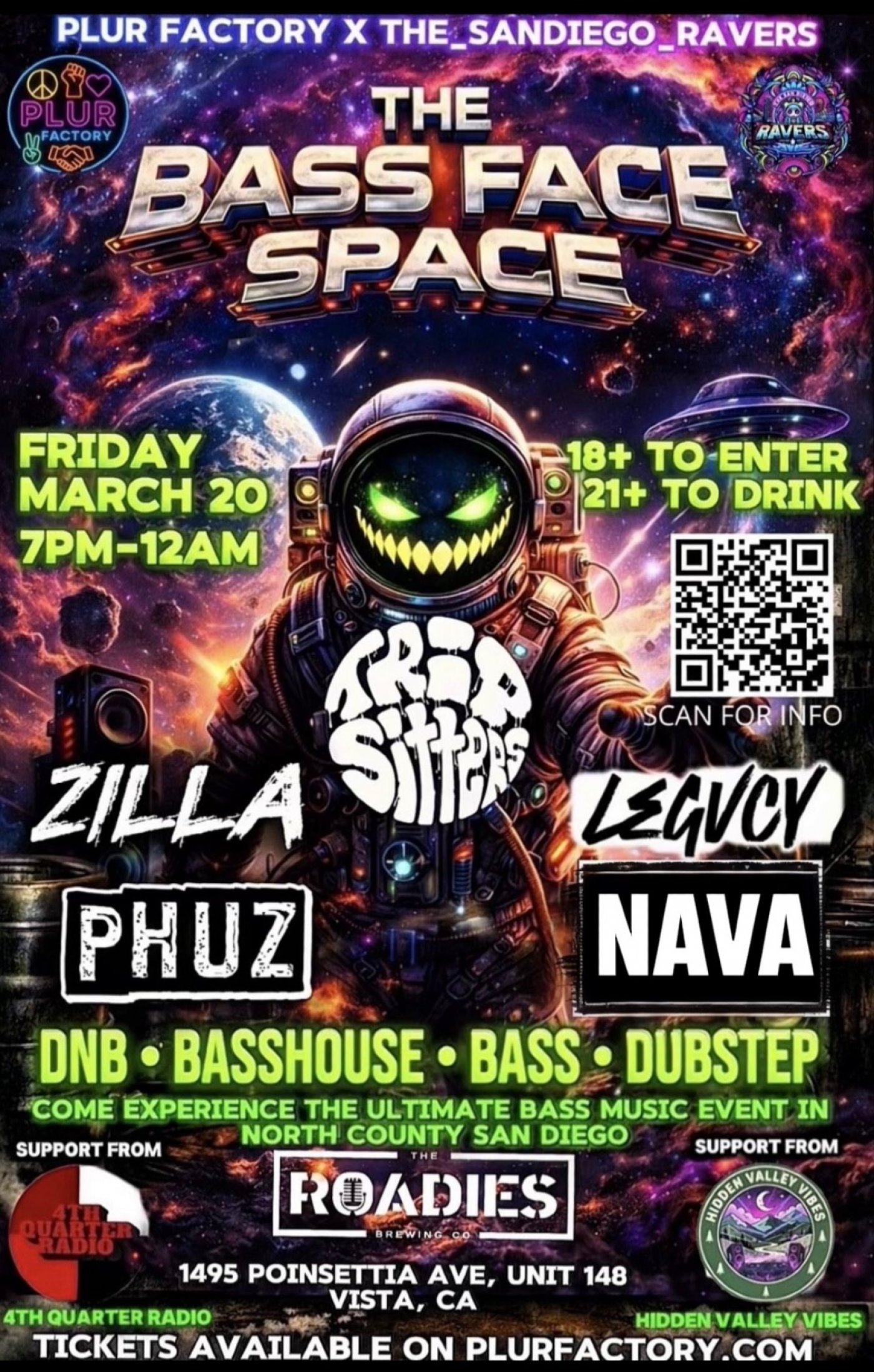 The Bass Face Space is North County San Diego’s Biggest Electronic Bass Music Show of the Month! Multiple Bass Genres Will Be Played by Local talented DJs. If you’re looking for something fun to do Friday march 20th Come out to the BassFace Space!