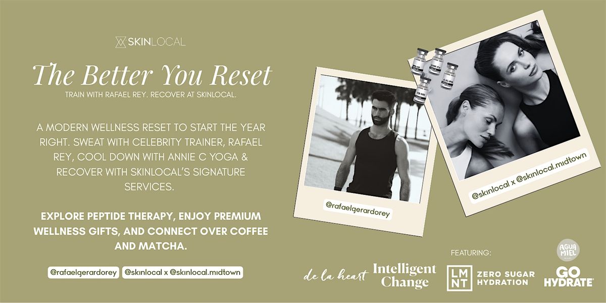 A modern wellness reset to start the year right. Sweat with CELEBRITY TRAINER, Rafael Rey, cool down with Annie Caballero, yoga instructor & holistic health coach, and recover with SkinLocal’s signature services: infrared sauna, cold-plunge & B12 shots. Explore peptide therapy, enjoy premium wellness gifts, and connect over coffee and matcha.
