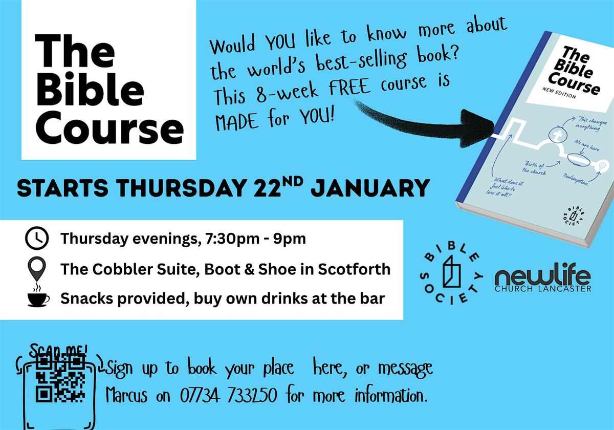 Whether you are new to the Bible and just curious about it as a book, already a reader but want to understand better, or perhaps you class yourself as a person wiht a strong faith and knowledge of the Bible... this course is for you. Andrew Ollerton and his team present eight video sessions which we will watch together, interspersed by discussion. Anyone who signs up for the course can also purchase a copy of the Bible Course workbook a half price, subsidised by New Life Church Lancaster.