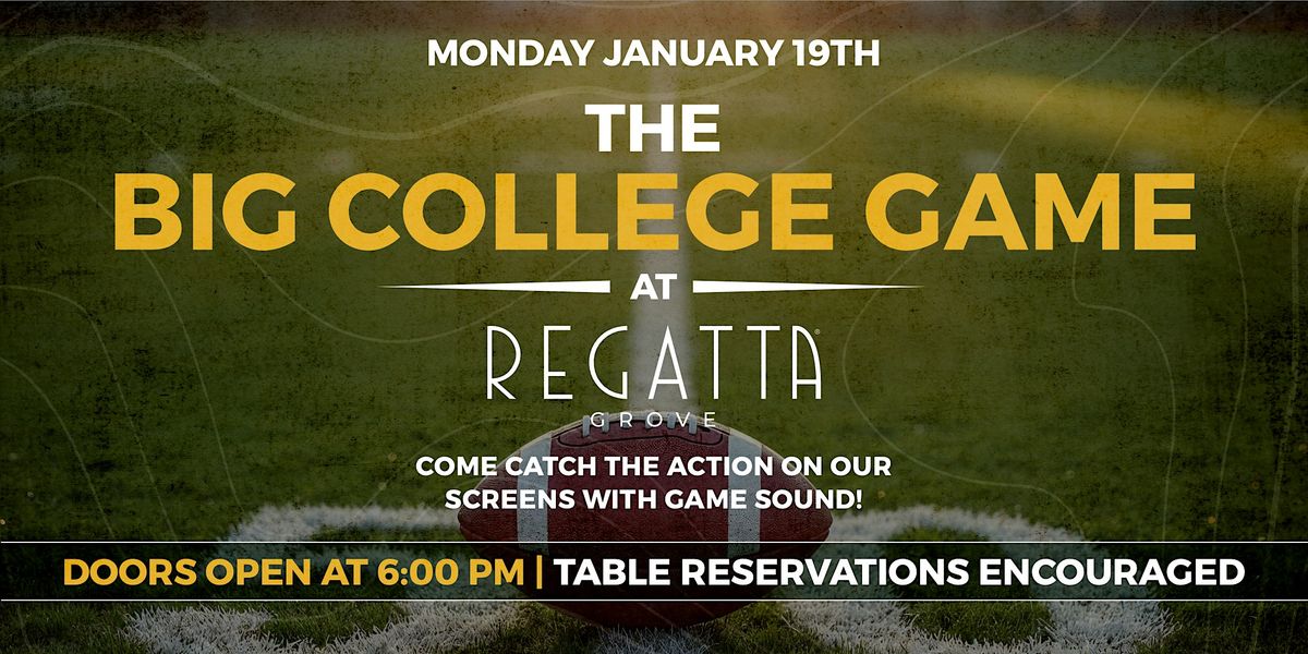 Join us Monday, January 19th at Regatta Grove for The Big College Game. We’re bringing the full game-day experience with our screens, game sound ON, and unbeatable Regatta vibes all night.