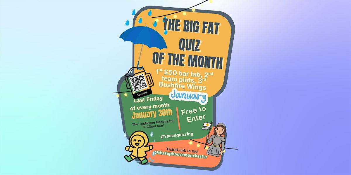 Welcome to The Big Fat Quiz of the Month! Join us for a fun-filled evening of trivia, laughter, and great drinks at The Taphouse Manchester. Test your knowledge on a variety of topics and compete with friends for the ultimate bragging rights. Don't miss out on this exciting in-person event - it's the perfect way to kick back and unwind after a long week. See you there!