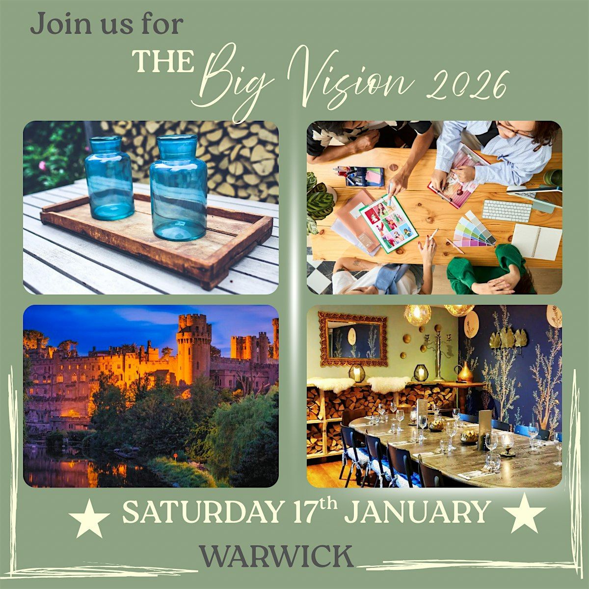 We will start the day with welcomes and tea & coffee. Then jump into the first session on Dreaming Big followed by starting our Vision Boards. Everyone will receive a Vision Board kit containing stickers, ephemera, motivational quotes, pens, glue and more!