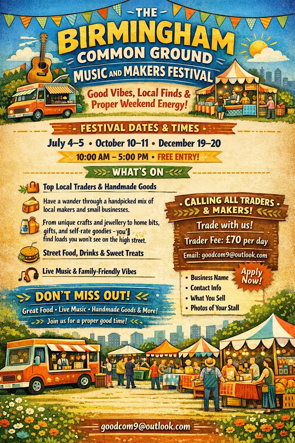 Got a small business, food truck, or handmade brand? Come trade with us at the Birmingham Common Ground Music and Makers Festival and get your name out there!