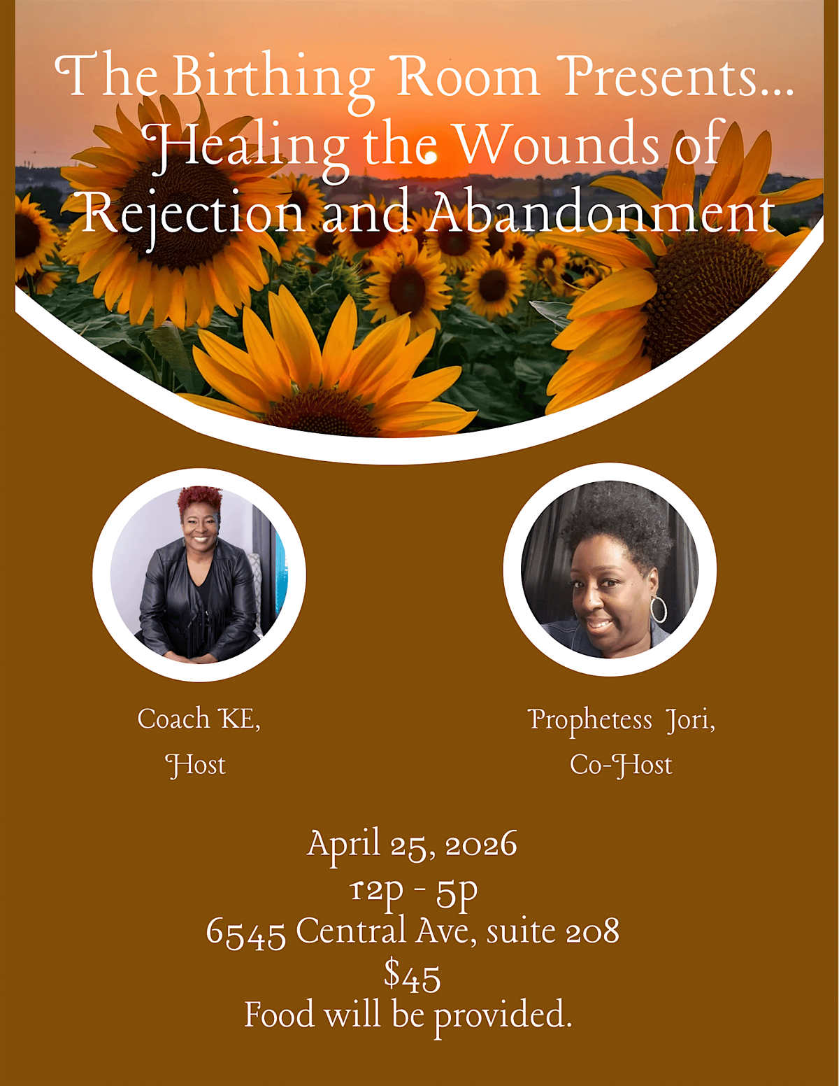The Birthing Room Presents: Healing the Wounds of Rejection and Abandonment is a sacred space for women to experience healing, restoration, and deliverance through the Word of God. This workshop addresses the often-hidden wounds of rejection and abandonment that impact identity, relationships, and purpose. Through biblical teaching, guided reflection, and prophetic insight, women will identify and confront the roots of these wounds, break agreement with lies, and receive practical tools to walk in freedom. As God heals the wounded places of the soul, clarity, confidence, and purpose are restored. This is an invitation to release what has been carried too long and allow God to bring forth wholeness, healing, and renewed identity.