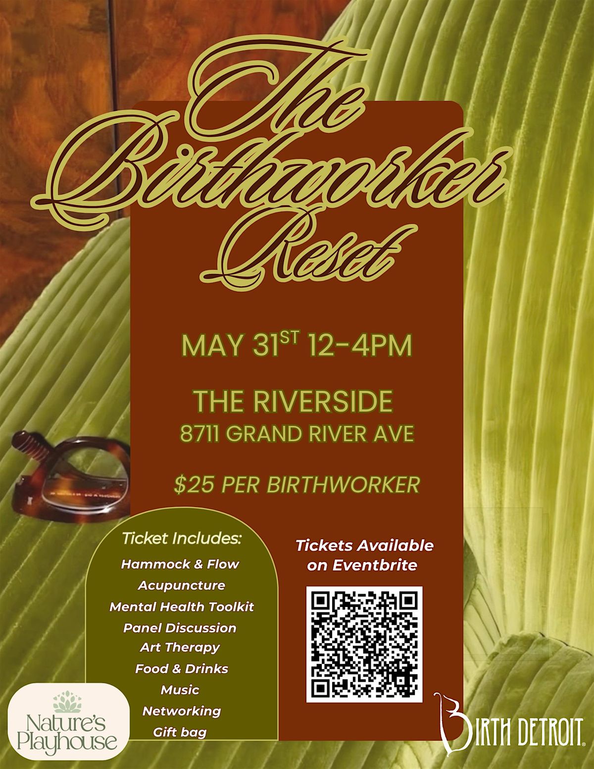 Birthworker Reset: relax, restore, and reconnect with hammock flow, panel talks, mental health tools, acupuncture, food, drinks & more.