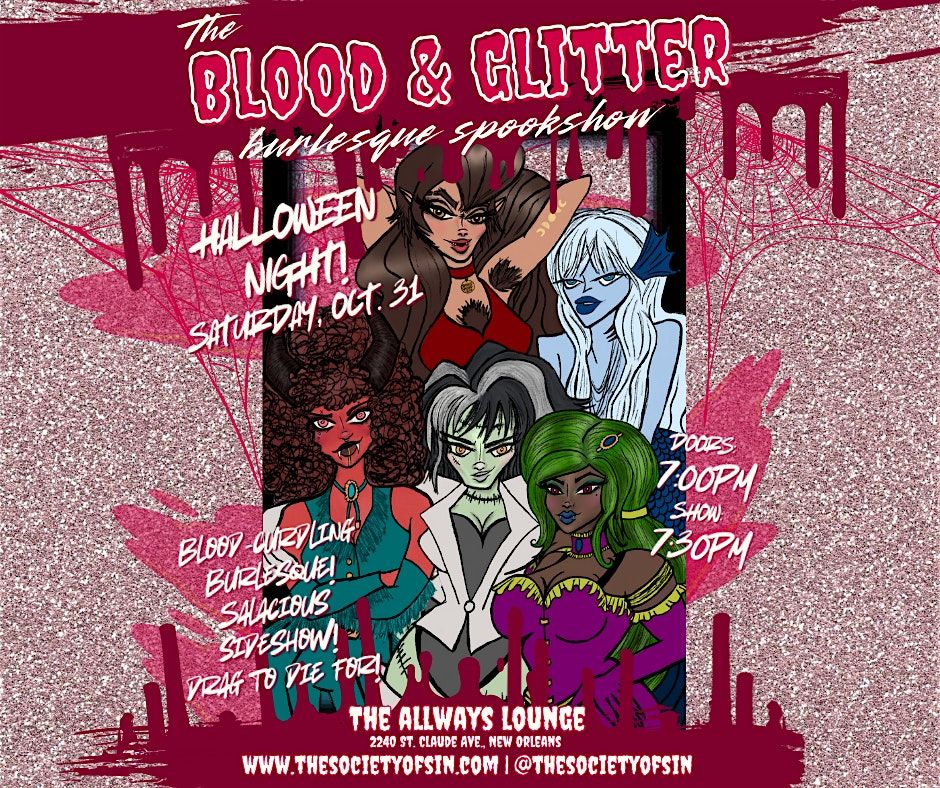 Kick off your Halloween night with NOLA's most glamorous showghouls at "The Blood & Glitter Burlesque Spookshow," bigger, badder, and bloodier than ever before! Join The Society of Sin Burlesque & Variety for an evening of scintillatingly spooky performances inspired by tales of classic horror for ONE NIGHT ONLY!