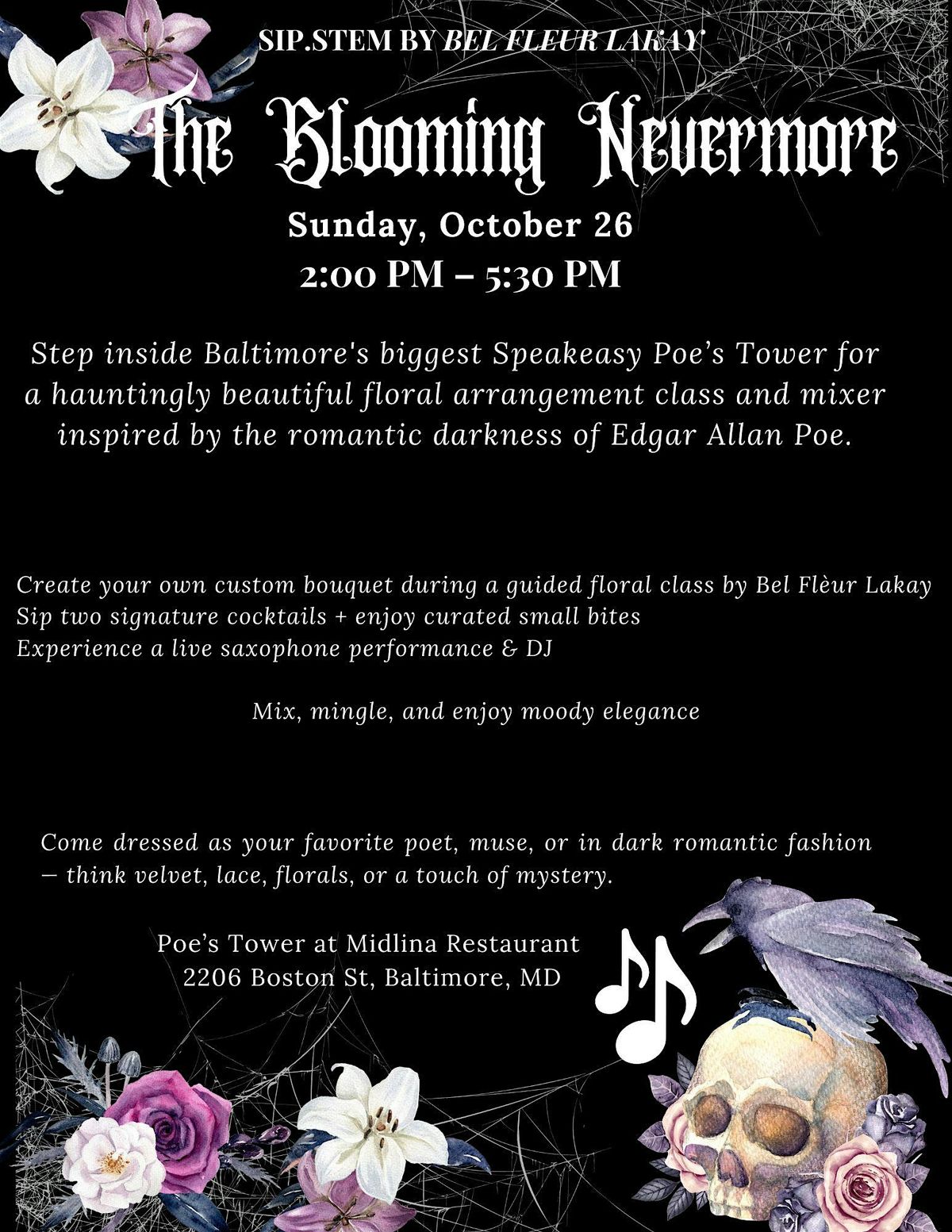 Step inside Baltimore’s largest speakeasy, Poe’s Tower, for The Blooming Nevermore — a hauntingly beautiful afternoon of floral design, cocktails, and live music.