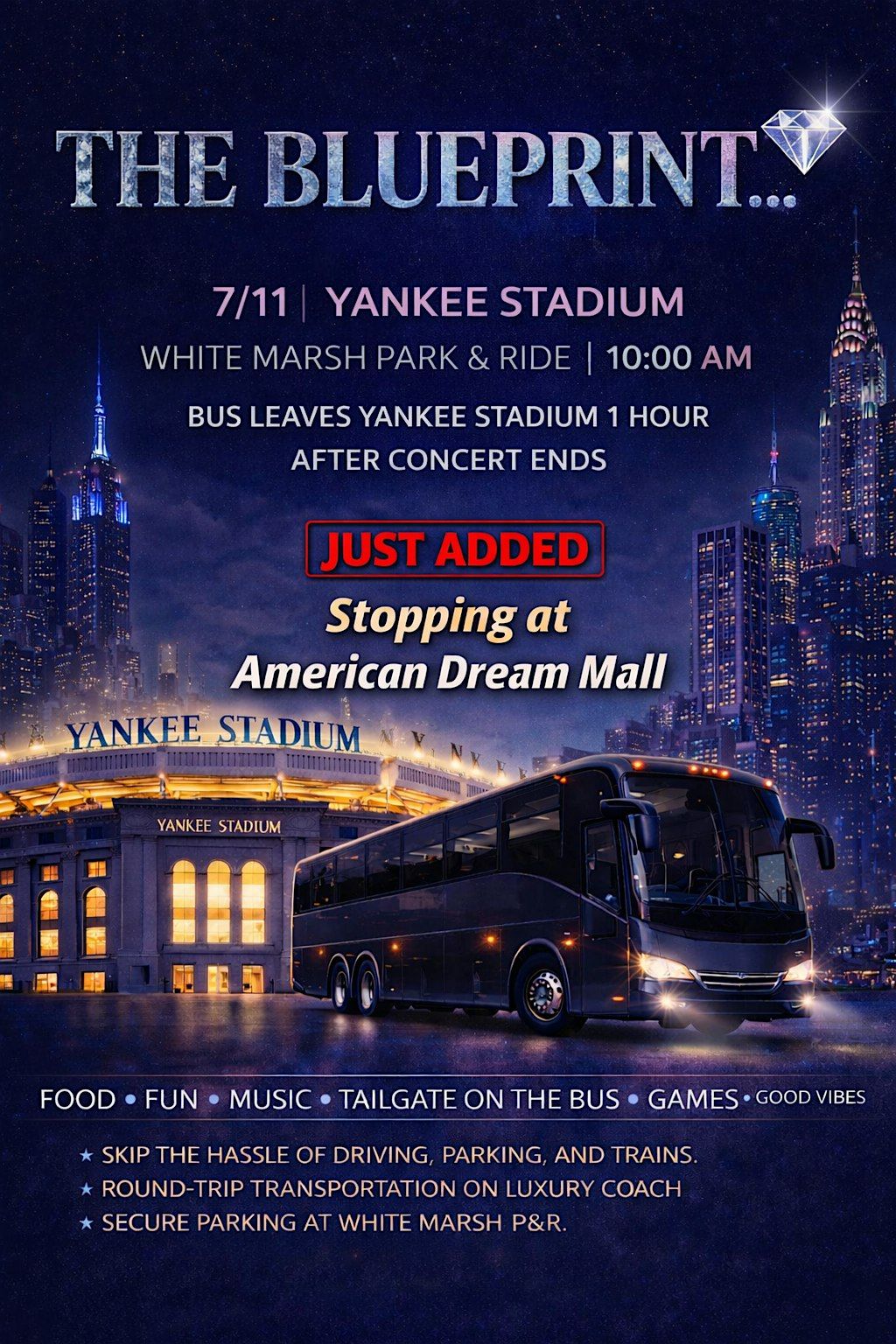 If you're heading to "The Blueprint" on 7/12/2026 hop on the bus with us and avoid driving, trains and the headache of getting there. We will leave from White Marsh Park & Ride at 10am make a quick stop at American Dream Mall in New Jersey so that we are not walking around in the heat and then take the quick ride(depending on traffic) over to the stadium for the concert. We will have music, fun, games and prizes on the bus. We turn up, and you don't want to miss it. It's early and tickets are going FAST!