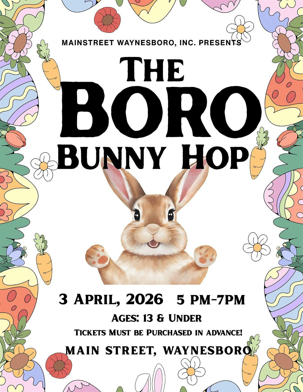 Join us for the inaugural Boro Bunny Hop! Bring the kiddos downtown and into participating businesses to collect easter eggs! Plus, surpise golden eggs hidden through downtown! This event is open to youth 13 & under. Please note: Parents do not need to purchase a ticket. This event is a fundraiser & proceeds benefit Mainstreet Waynesboro, Inc.