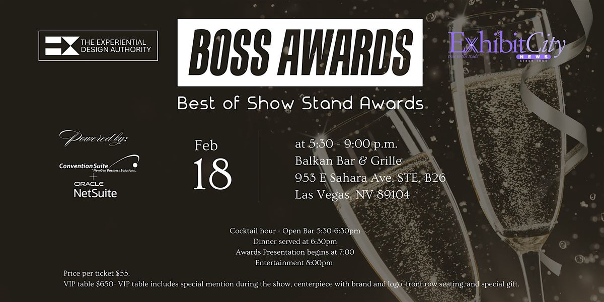 Get ready for an unforgettable night celebrating the movers and shakers making waves in the tradeshow industry! The BOSS Awards are where talent is recognized. Join us for this in-person event to connect and be inspired by the best of the best. This is not just an event—it's a celebration of boldness, passion, and success. Don’t miss out on the energy and excitement that only The BOSS Awards can deliver!The event will begin at 5:30pm with an open bar cocktail hour, followed by dinner, desert, an award presentation, and live entertainment. VIP/Company tables seat eight and include a mention during the show, branded centerpieces, and a special gift.