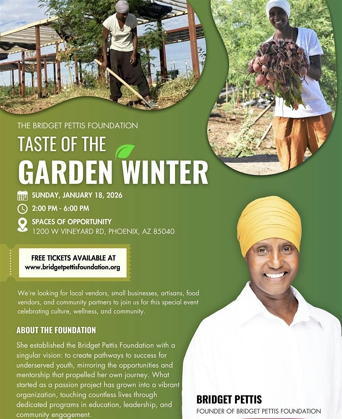 Welcome to The Bridget Pettis Foundation-Taste Of Garden Winter Event! Join us at Spaces Of Opportunity on January 18, 2026 at 2:00 PM for a day filled with delicious food and community fun. The event will showcase a variety of garden-fresh dishes and local vendors. Don't miss out on this opportunity to support a great cause and enjoy some tasty treats. See you there!