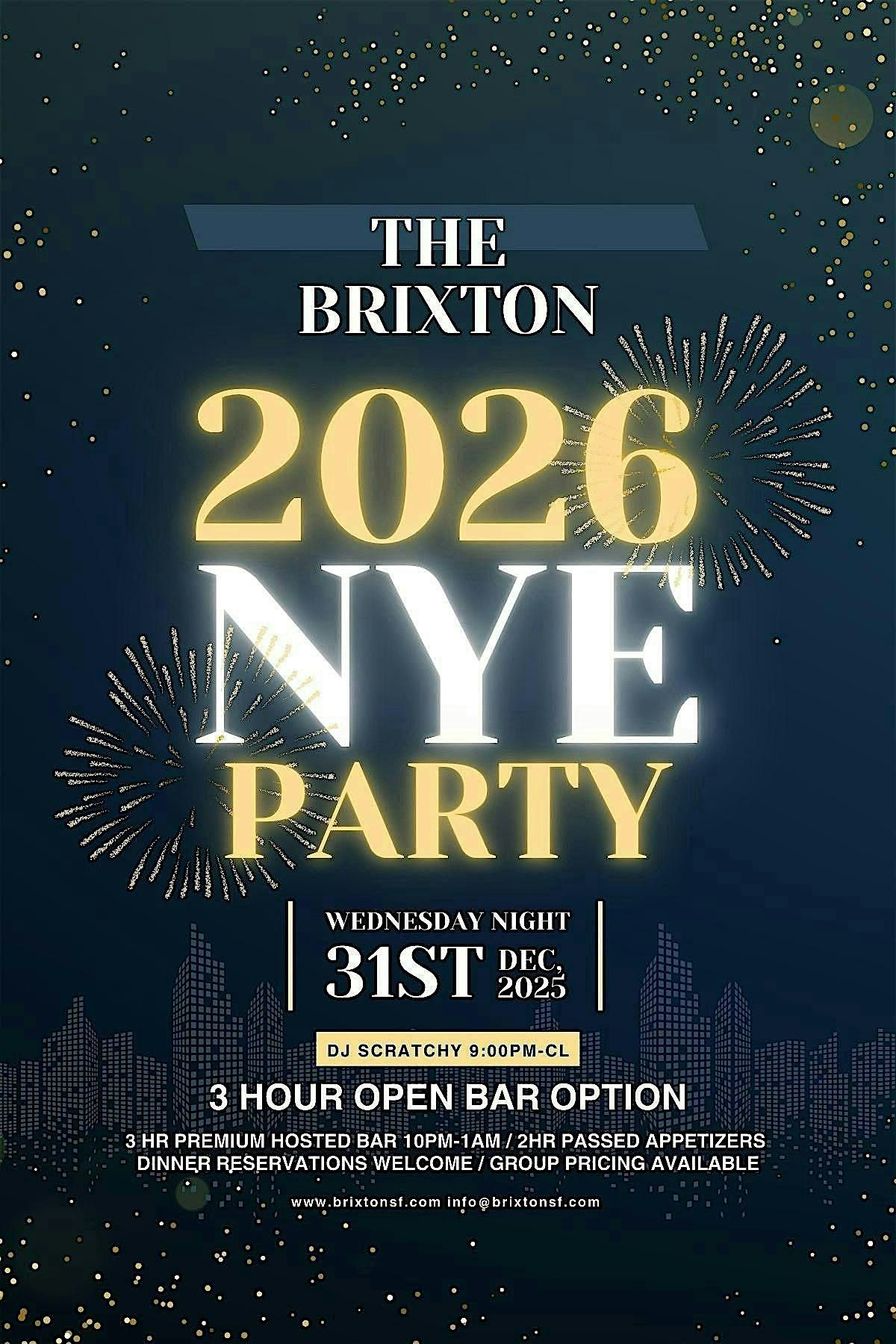 The Brixton New Years Eve 2026 Premium Open Bar Package Join us on December 31, 2025 for a night to remember. Your ticket gets you 3 hour premium open bar10pm-1am,2 hours passed appetizers 10pm-12am with DJ Scratchy providing the soundtrack for a night to remember