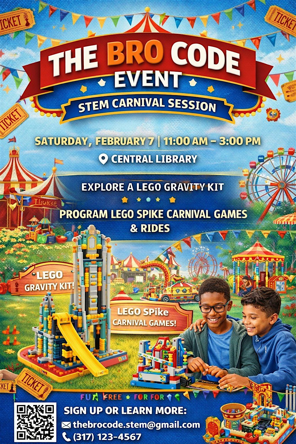 Join us for a fun, hands-on STEM Carnival experience with The Bro Code! Boys in grades Kβ12 will explore a LEGO Gravity Kit and program LEGO SPIKE carnival games and rides, combining creativity, engineering, and problem-solving.