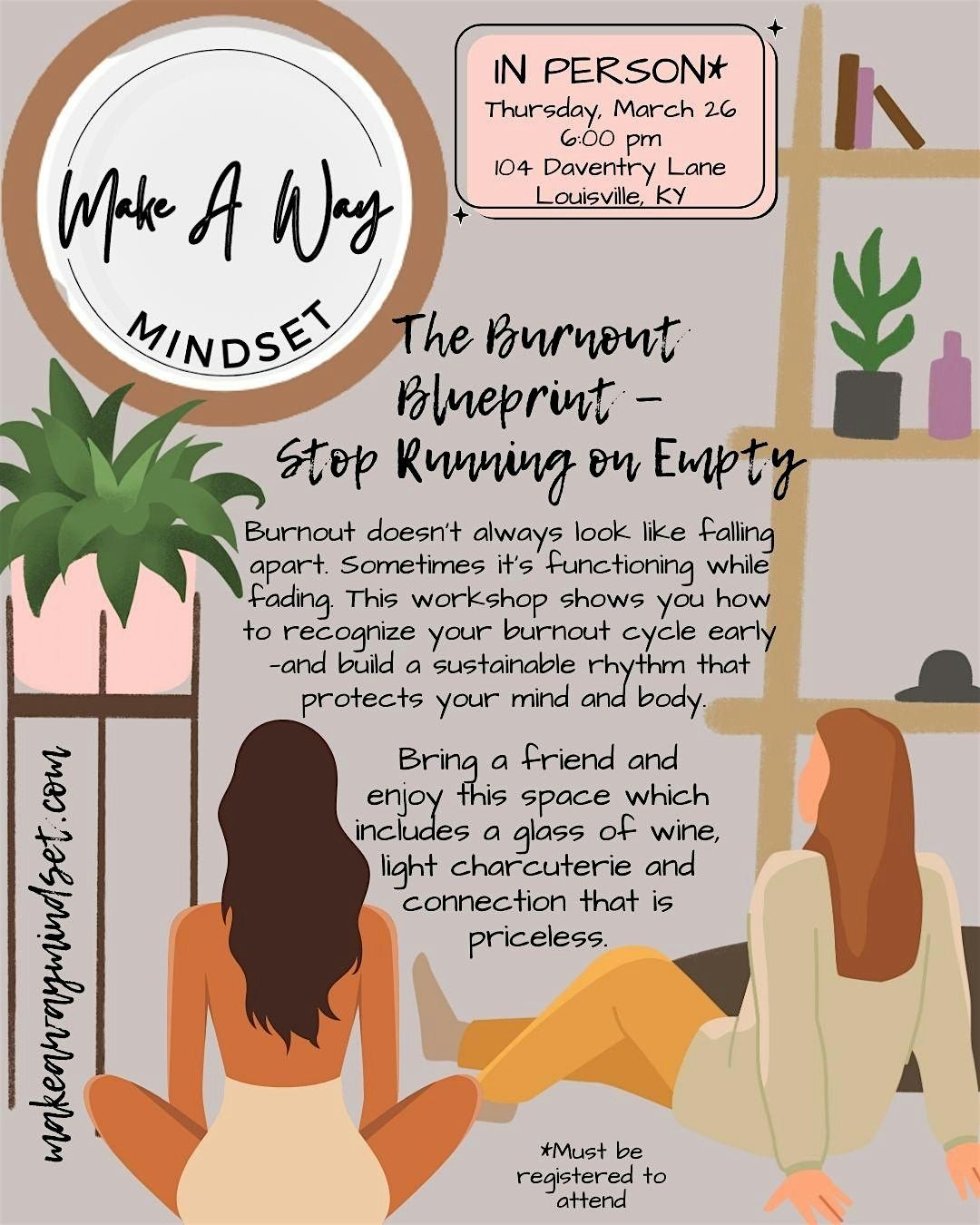This workshop shows you how to recognize your burnout cycle early—and build a sustainable rhythm that protects your mind and body. Bring a friend and enjoy this space which includes a glass of wine, light charcuterie and connection that is priceless.