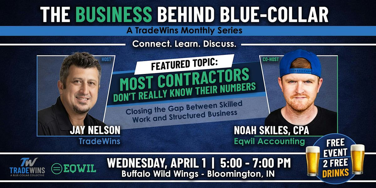 Info: Most contractors donโt struggle because theyโre bad at the work. Many are skilled, busy, and profitable. The real challenge is that very few were ever taught how to intentionally build the business underneath the work. Structure, systems, clear numbers, and defined roles are what allow a trade business to grow without running entirely through the owner. The Business Behind Blue-Collar exists to help contractors understand and build that missing layer. This monthly series is not a sales pitch or a theory-heavy workshop. Itโs a practical, operator-led conversation about how real trade businesses are structured, run, and grown over time. Each session is designed to create clarity around real decisions contractors are already facing and to learn alongside others in the trades. For those who want to go deeper, TradeWins also offers structured education beyond these monthly conversations, including an upcoming in-person course through Ivy Tech. Details are shared at the event.