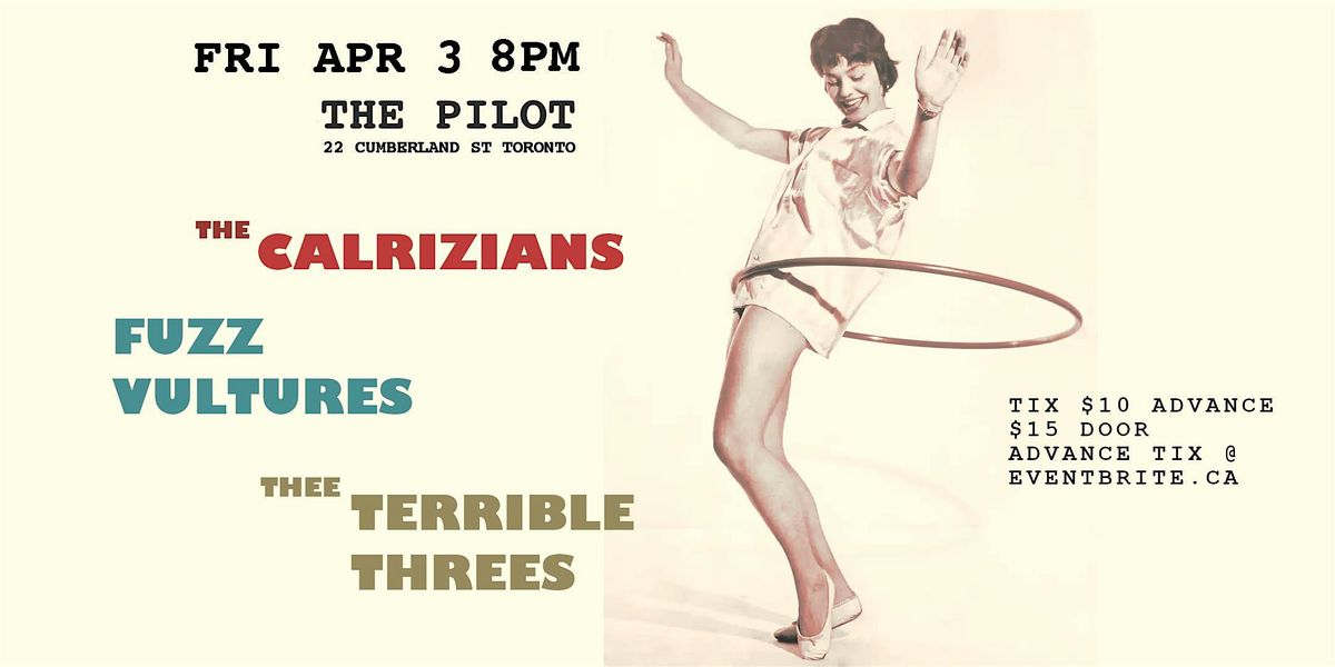 TORONTO! Friday April 3rd at the Pilot! The hot new/old rnr destination. Dontcha dare miss The Calrizians (Toronto surf n spy) in tow with Fuzz Vultures (fuzzed rite tire slashing surf) & The Terrible Threes (busted up Toronto garage rock from your psychotic nightmares). Advanced tickets will be available. Please consider purchasing ahead of time as it really helps all of us involved from the venue on down!