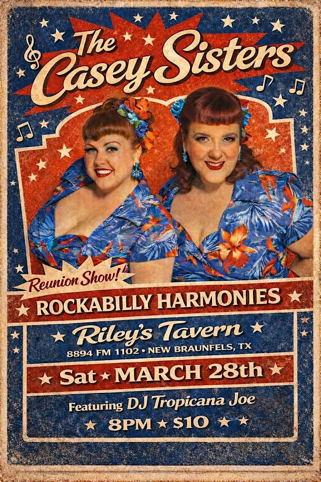 Get ready for a rockin' good time with the Casey Sisters! Featuring members of Cave Catt Sammy. This in-person reunion is all about classic rockabilly vibes, great tunes, and awesome company. Whether you're a die-hard fan or just wanna soak up the cool retro atmosphere, this is the place to be. Don your vintage duds, bring your best dance moves, and join the fun! Dj. Tropicana Joe between sets.