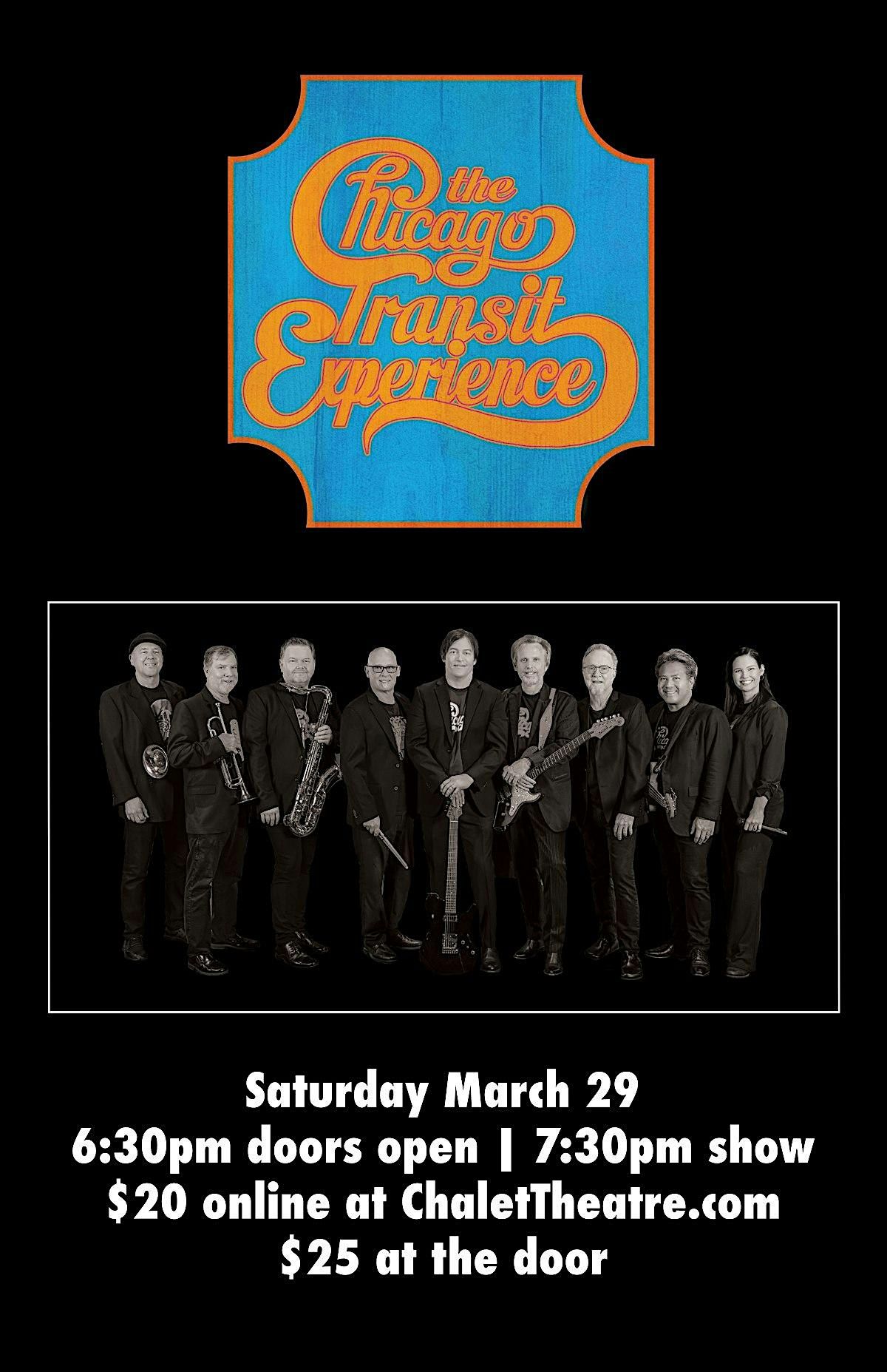 The Chicago Transit experience is Seattle’s own tribute to the music of Chicago. Performing such classic hits as “Saturday in the Park”, “25 or 6 to 4”, “Colour My World”, “Make me Smile”, and “You’re the Inspiration”, this 9-piece band faithfully recreates Chicago’s legendary blend of rock, jazz, R & B and classical music. With powerful vocal harmonies and a dynamic horn section, and featuring some of the most talented and accomplished musicians from around the Northwest, the Chicago Transit Experience delivers the very best of Chicago’s music.