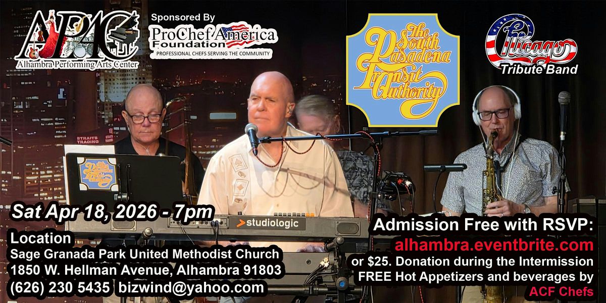 Get ready for a high-energy night of classic jazz-rock as APAC Presents: The Chicago Tribute Band, performed by The South Pasadena Transit Authority, takes the stage on Saturday, April 18, 2026. This nine-member ensemble brings the iconic sound of the legendary, Grammy Award-winning band Chicago to life with powerful horn arrangements, rich vocals, and faithful musicianship.