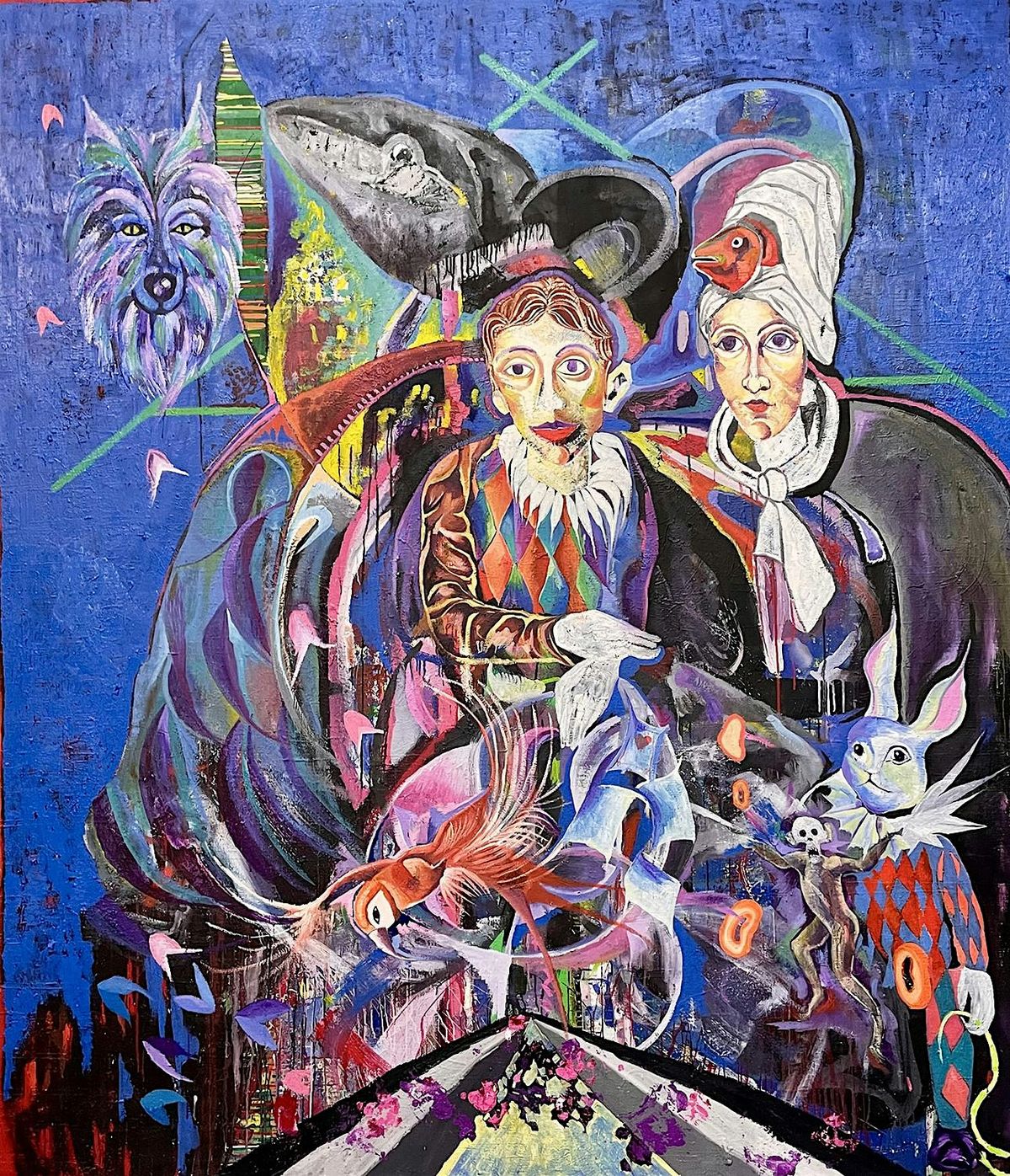 Florian Schulz erschafft eine surreale Traumwelt mit entrückten Figuren, Maskerade und mystischer Theatralik. Gespenstische Gesellschaften, verirrte Gruppierungen und Einzelfiguren bilden den Kern seiner narrativen Malerei, die geprägt ist von einer malerischen Eigenständigkeit. Der skurrile Kosmos wird teilweise farblich überhöht und inhaltlich überzeichnet, die Protagonisten sind stets geprägt von Traurigkeit und Melancholie. Die Traumdarstellungen sind große Fiktionen, bunt, mit kraftvollem Farbauftrag, immer variabel im malerischen Duktus. Die karnevalesken und bunt gemixten Charaktere bilden eine inszenierte Bühnendarstellung, es sind mehrschichtige Traumwelten mit denen Schulz den Betrachter in eine freie, wilde, clowneske Welt verführt. Seine Figuration enthält abstrakte Elemente, bekannte Hierarchien werden umgedreht, der Künstler erschafft sich einen Raum für die inszenierte Welt.