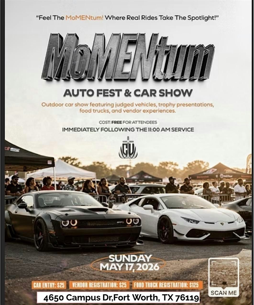 Get ready for an epic day in person! Join us at The chosen vessel for the Cathedral momentum auto Fest and Car Show. It's all about cool rides, great vibes, and meeting car lovers like you. Don’t miss out on this awesome hangout filled with sleek cars and fun moments. Come cruise with us and feel the momentum!