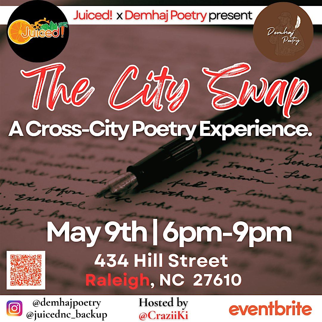 Juiced! x DemhajPoetry have partnered to curate a poetry show titled The City Swap! Come watch poets from the High Point & Raleigh areas perform! Hosted by CraziKii, this night will showcase poets from different cities as they come together to share their stories and vibes! 😎