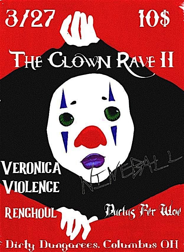 Veronica Violence, Nineball, Rhenghoul, and Ductus per Woe are celebrating halfway to halloween with the clown rave prt 2 at Dirty Dungarees