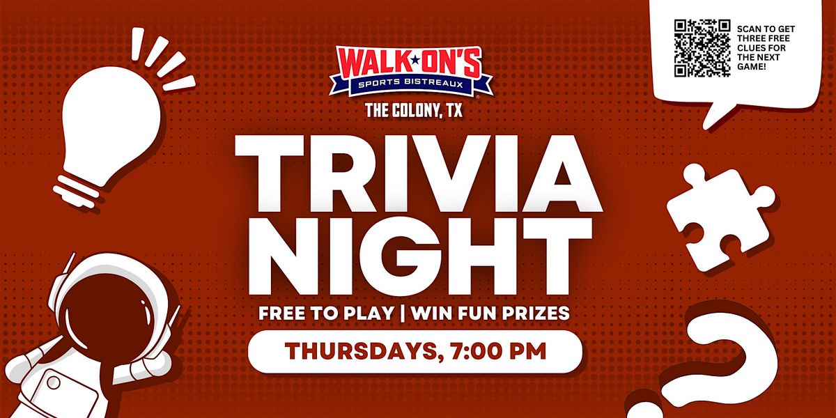 Join us for free live trivia every Thursday at 7pm at Walk-On's Sports Bistreaux, located at 5774 Grandscape Blvd Suite 200, The Colony, TX 75056! Free to play, and top teams win fun prizes!