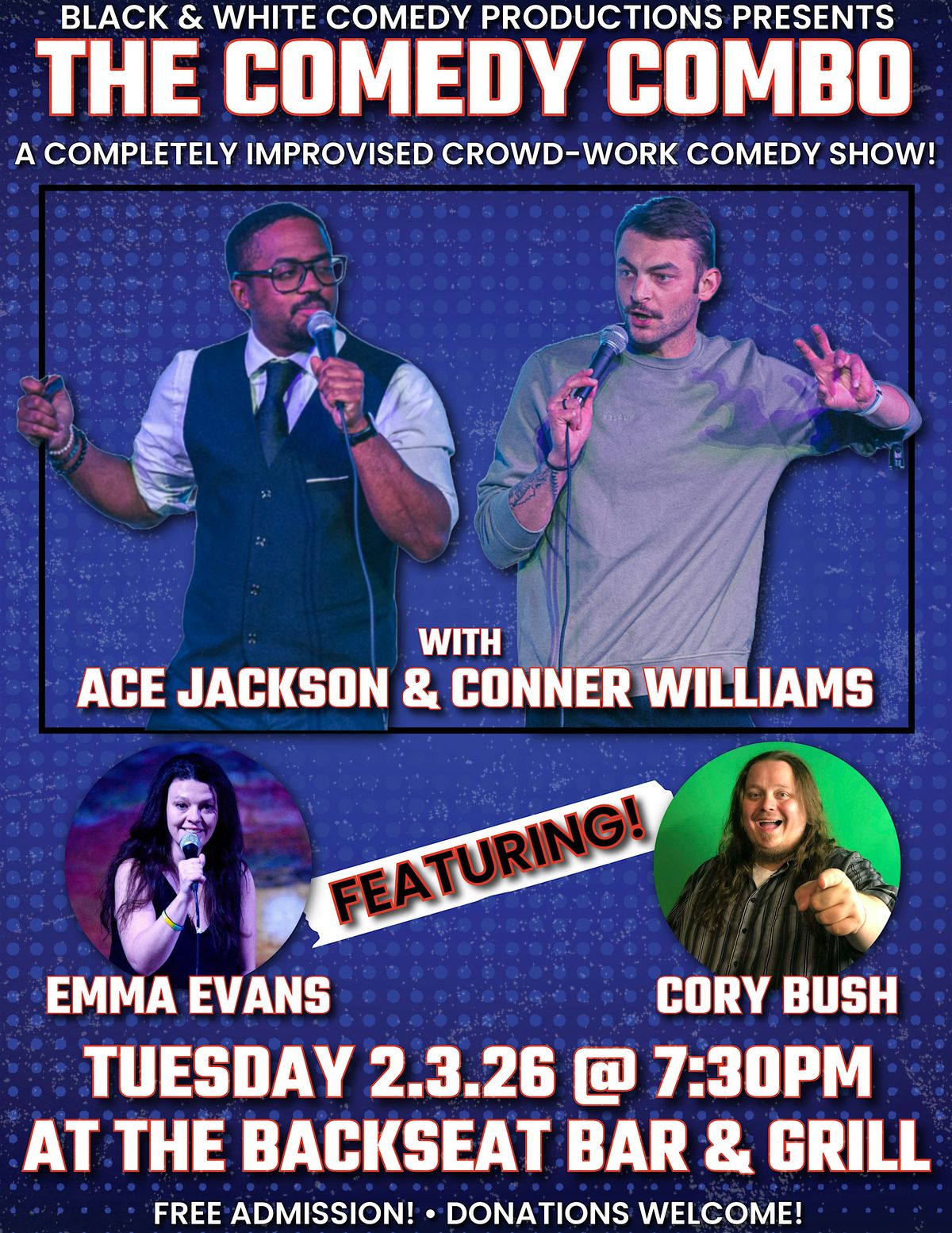 The duo from Black & White Comedy Productions Ace Jackson and Conner Williams are BACK at The Backseat, taking the stage together for an all-out improvised standup comedy crowd-work show packed with laughter! 🎤💥 And it’s FREE!