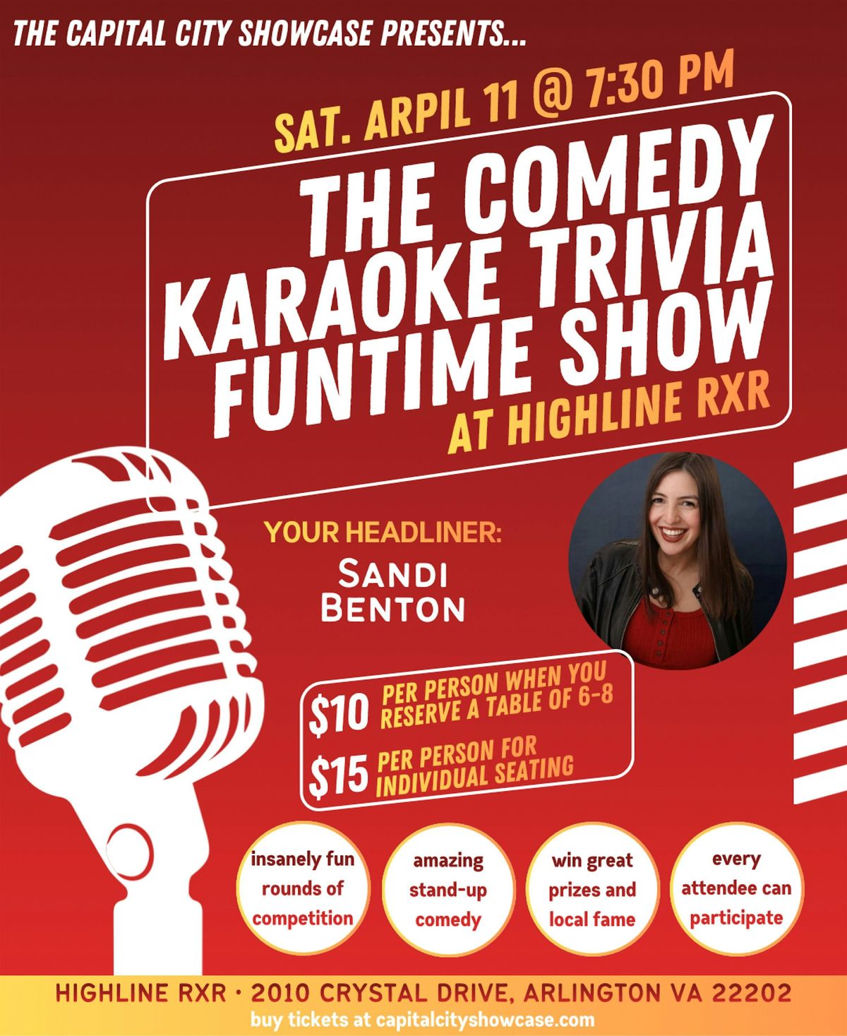 Hosted by Christian Hunt, this fantastic event is at Highline RxR, located at 2010 Crystal Drive, Arlington VA 22202. April's edition is on Saturday, April 11th, 2025 at 7:30pm. Doors open at 7:00pm.