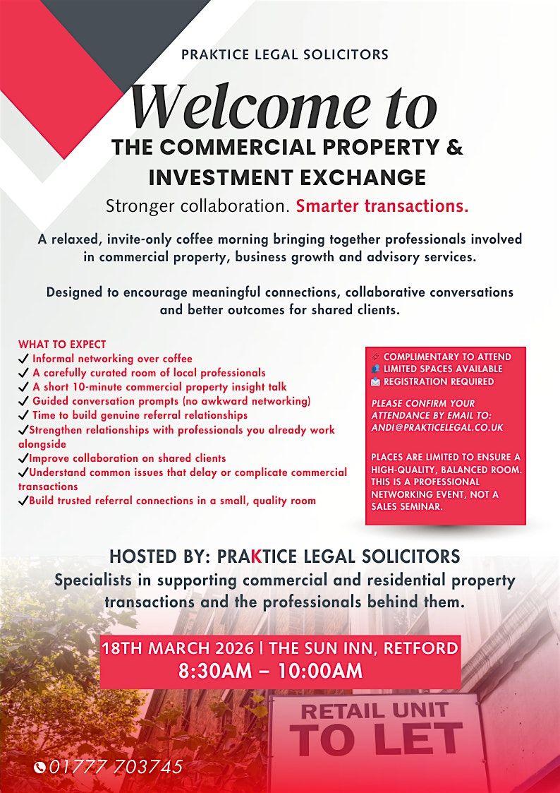 Whether you are a commercial agent, surveyor, broker, accountant, investor or professional adviser, this event offers an opportunity to connect with trusted local professionals in a focused, high-quality environment.