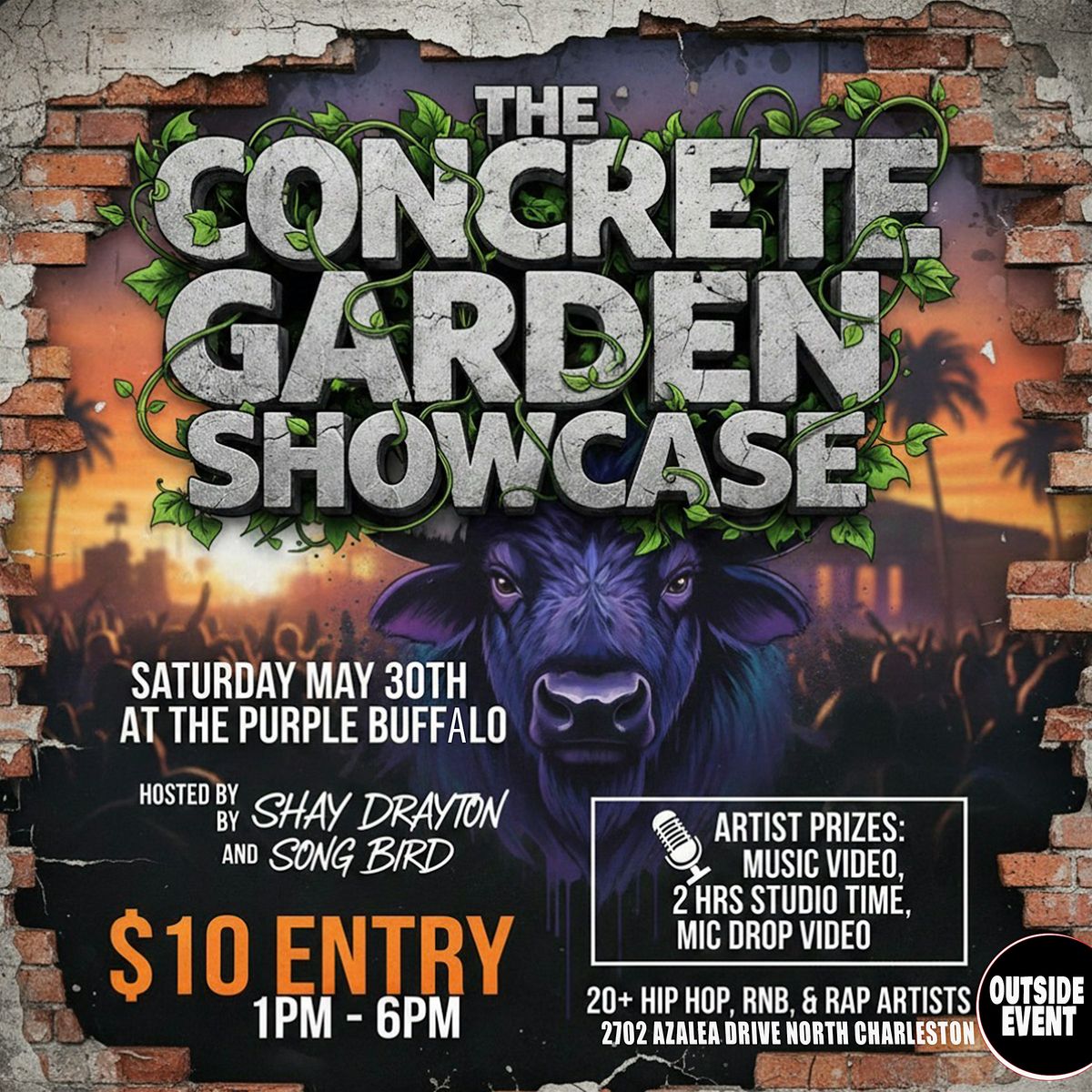Welcome to The Concrete Garden Showcase happening at The Purple Buffalo on May 30, 2026 at 1:00 PM (Eastern Time)! Get ready to immerse yourself in a world of creativity and beauty as we unveil artist in a outdoor showcase . Join us for an afternoon filled with inspiration, innovation, and of course, some good vibes. Whether you're a seasoned artist or just looking for some fresh ideas or a place to network , this event is perfect for everyone. Don't miss out on this unique opportunity to explore the endless talents of these local artist See you there!