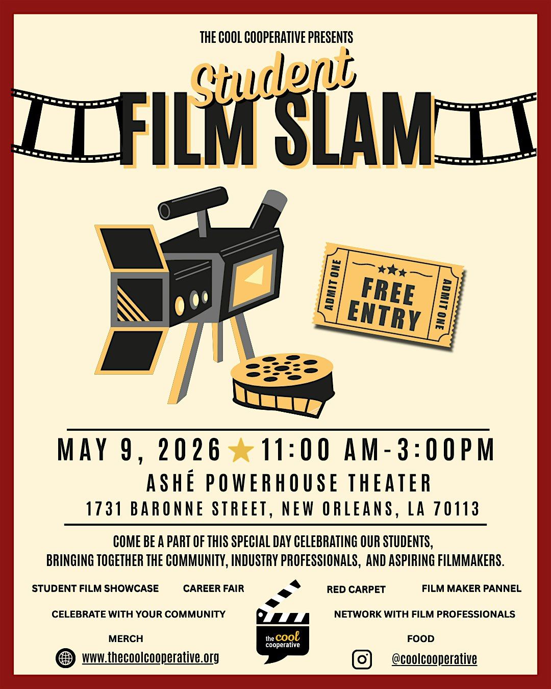 Join us for an exciting showcase of independent & student films. Get ready to immerse yourself in a world of creativity and storytelling brought to life on the big screen. Meet fellow film enthusiasts and engage in discussions about the art of cinema. Whether you're a filmmaker, actor, or simply a movie buff, this event is perfect for anyone passionate about the magic of movies. Don't miss out on this unique opportunity to experience the thrill of Film Slam in person!