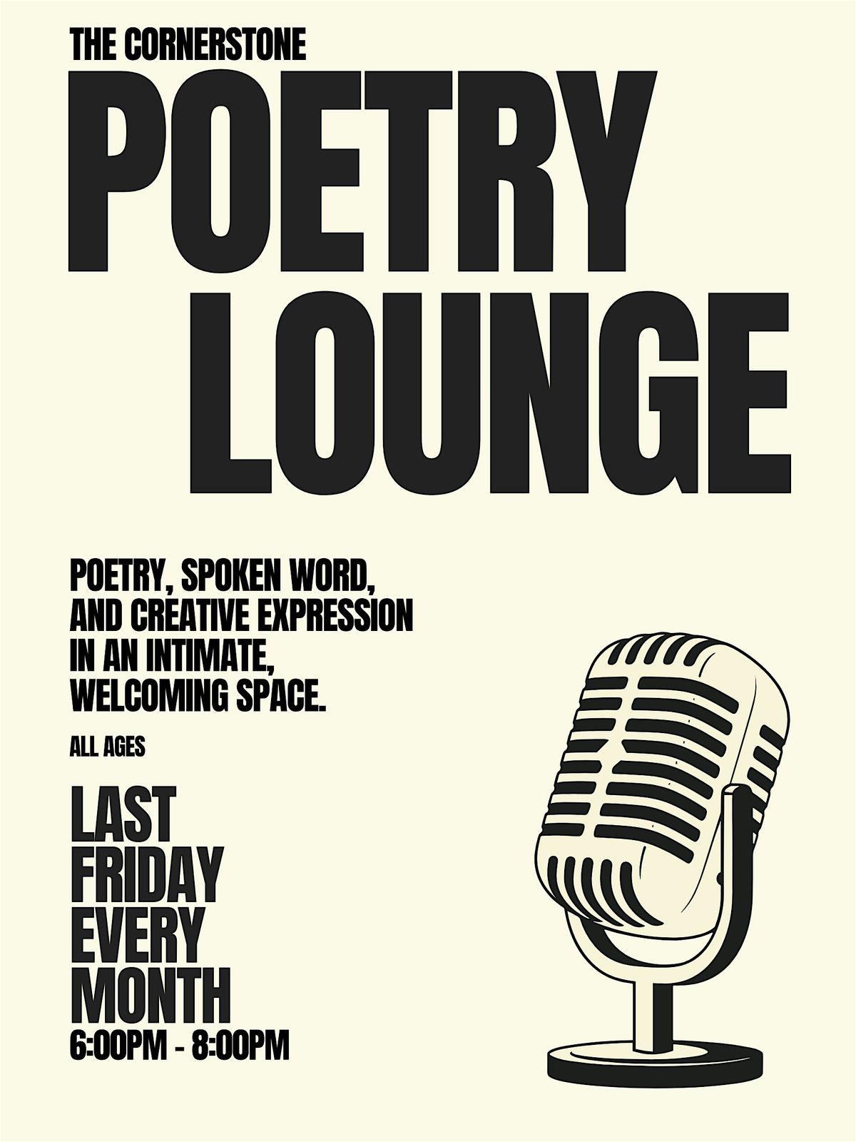 Join us on the last Friday of each month for The Cornerstone Poetry Lounge — an evening of poetry, spoken word, and creative expression in an intimate, welcoming space.