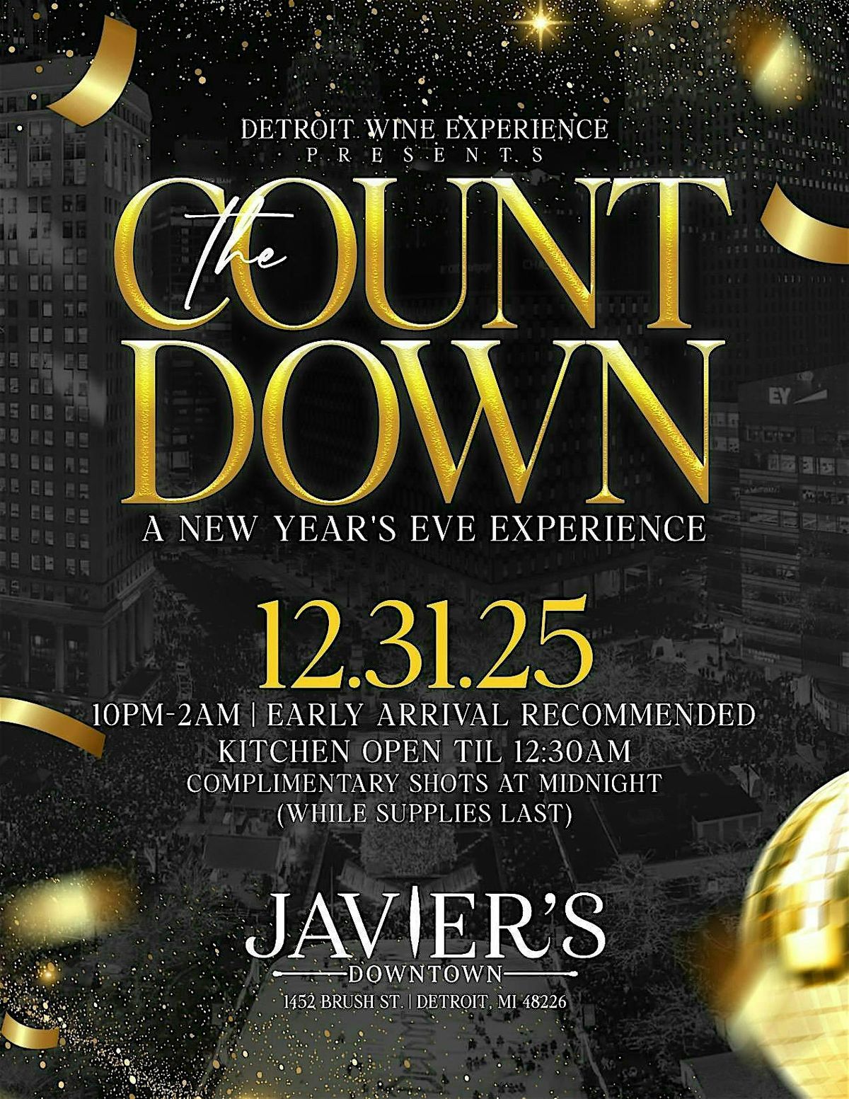Welcome to The Countdown NYE Presented By Detroit Wine Experience! Join us at Javier’s Downtown on December 31, 2025 at 10:00 PM