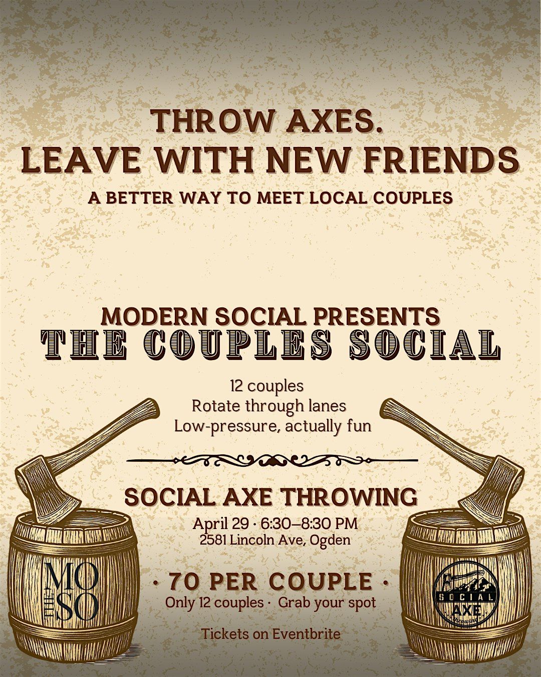 We’re hosting a structured axe throwing night where you rotate through lanes and meet other couples along the way.