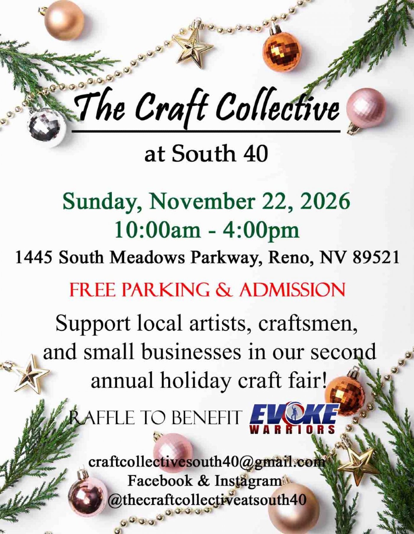 Join us for our 2nd annual holiday craft fair! Featuring 25+ local vendors and businesses with handcrafted goodies. Free parking and admission. Raffle to support Evoke Warriors.