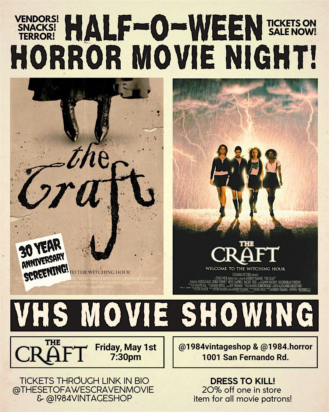 Join us @1984vintageshop & @1984horror to celebrate 30 years of The Craft this Half-O-Ween! Grab your coven to welcome the Witching Hour!About this Event