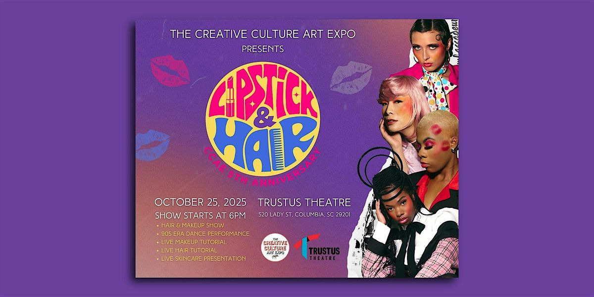 Welcome to The Creative Culture Art Expo Presents LIPSTICK & HAIR! Join us at Trustus Theatre for a vibrant celebration of beauty and creativity. This event will showcase the a unique take on hair and makeup show featuring plenty of special guest performers. Immerse yourself in a world where colors, textures, and styles collide to inspire and captivate. Don't miss this opportunity to experience the magic of artistic expression in person. Get ready to be dazzled!.....