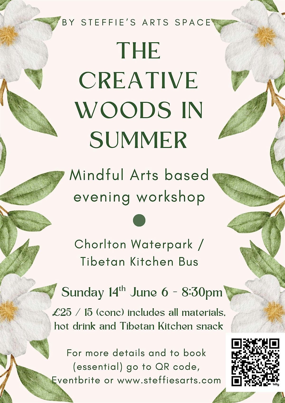 The Creative Woods offers this lovely evening wellbeing workshop to celebrate Summer at Chorlton Waterpark. This is part of a series of workshops responding to the changes in Nature through the seasons. Through mindful and arts based activities we will have a space to just be, and deepen our connection with Nature in new ways. Weather permitting, we will hopefully have time plenty of time outdoors, and also in and around the cosy Tibetan Kitchen converted bus. Please note the stairs in the bus are steepish, there is a banister. There is a toilet nearby.
