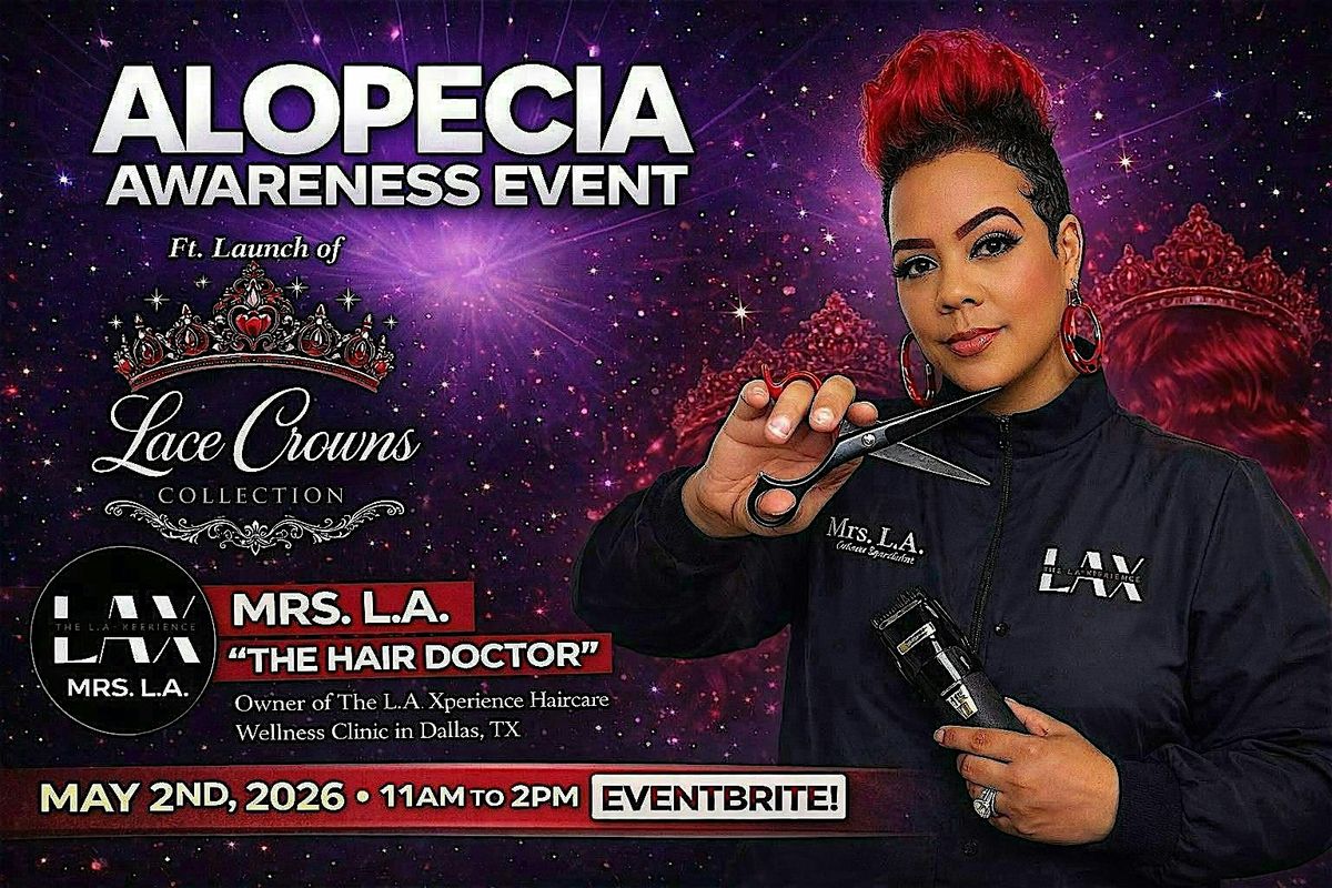 Stop struggling with hair loss in silence. Join Mrs. L.A. “The Hair Doctor” for a powerful Alopecia Awareness Event where you’ll learn what’s really going on with your hair and how to fix it. Experience the launch of our Lace Crowns Collection, get discounted Hair & Scalp and Skin Analysis, tour our clinic, and secure your appointment. Plus, enjoy light refreshments and giveaways in an uplifting, confidence-building environment.