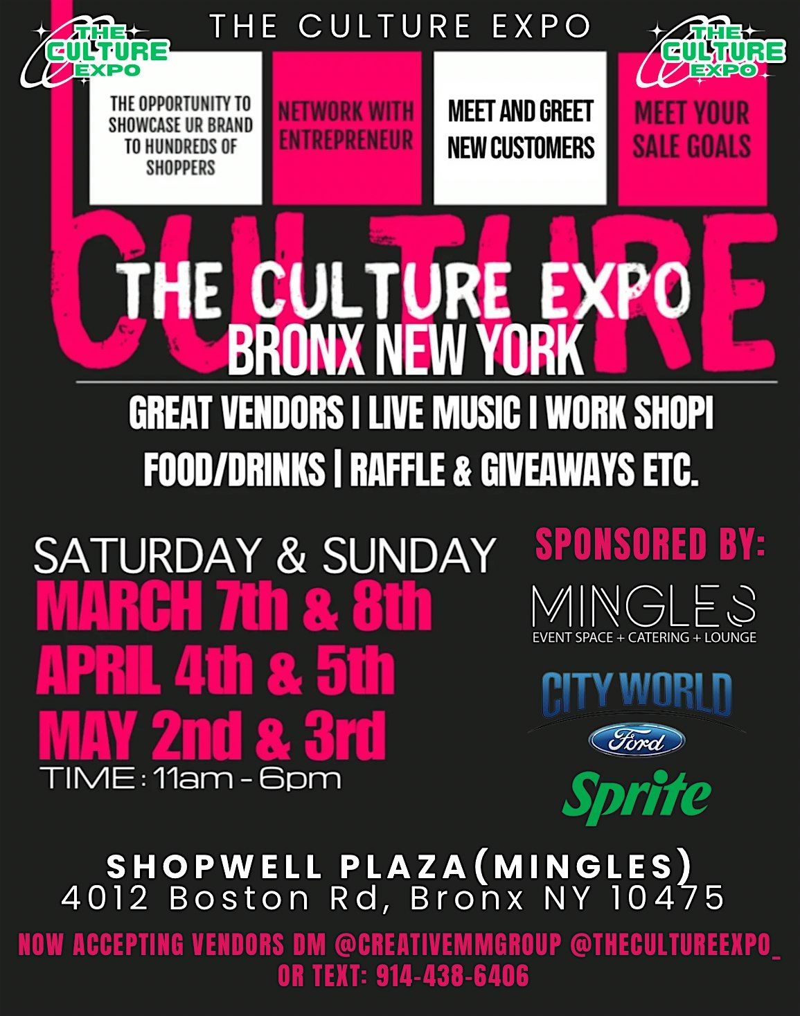 Join us at The Culture Expo at Shopwell Plaza (Mingles) in the Bronx for an exciting event spread across three weekends: