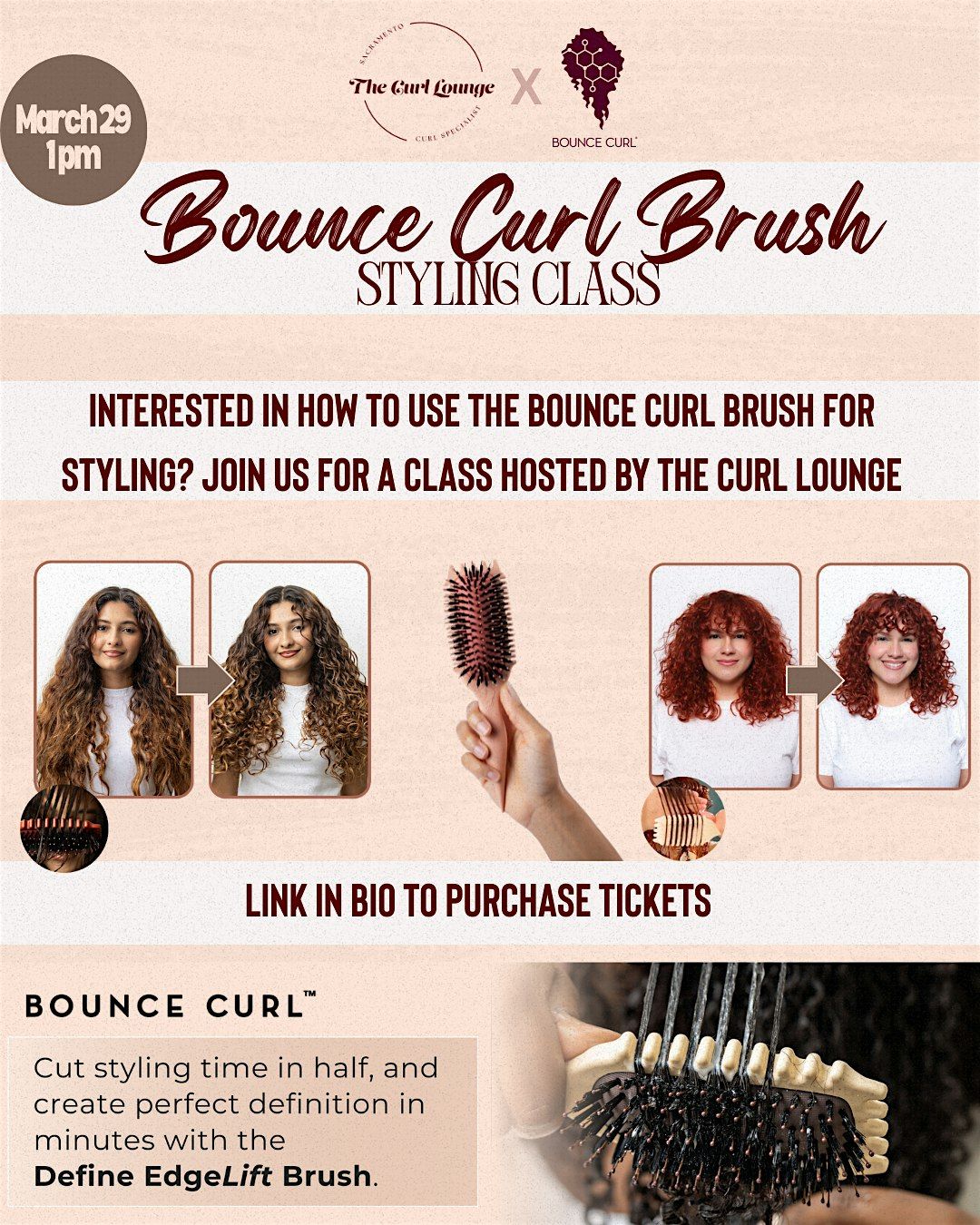 Hey curly beauties! Join The Curl Lounge for a special styling class sponsored by Bounce Curl. This interactive experience is designed for anyone looking to improve their curl routine and learn to use Bounce Curl's signature brushes properly.
