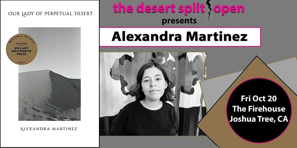 Friday, October 20, 5-7 PM, the Desert Split Open is excited to present local poet Alexandra Martinez. Let’s meet at The Firehouse (65430 Winters Road, Joshua Tree, CA). Alexandra will read from her collection, Our Lady of Perpetual Desert, which won Inlandia’s Hillary Gravendyk Prize. Following her reading, she will sit down for a brief conversation with Susan Rukeyser, who is likely to ask about the collection’s various feminist themes and Alexandra’s personal experience as a poet, so far! Then we will break for complimentary refreshments and an opportunity to purchase copies of the book, signed by the author.