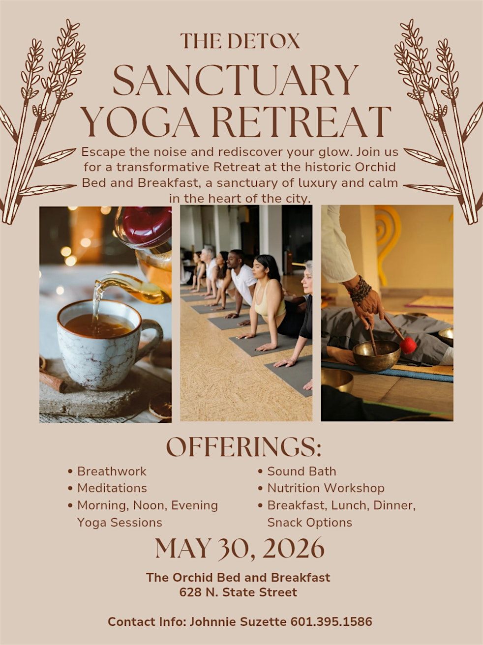 Escape the noise and rediscover your glow. Join us for a transformative Detox Yoga Retreat at the historic Orchid Bed and Breakfast, a sanctuary of luxury and calm in the heart of the city.