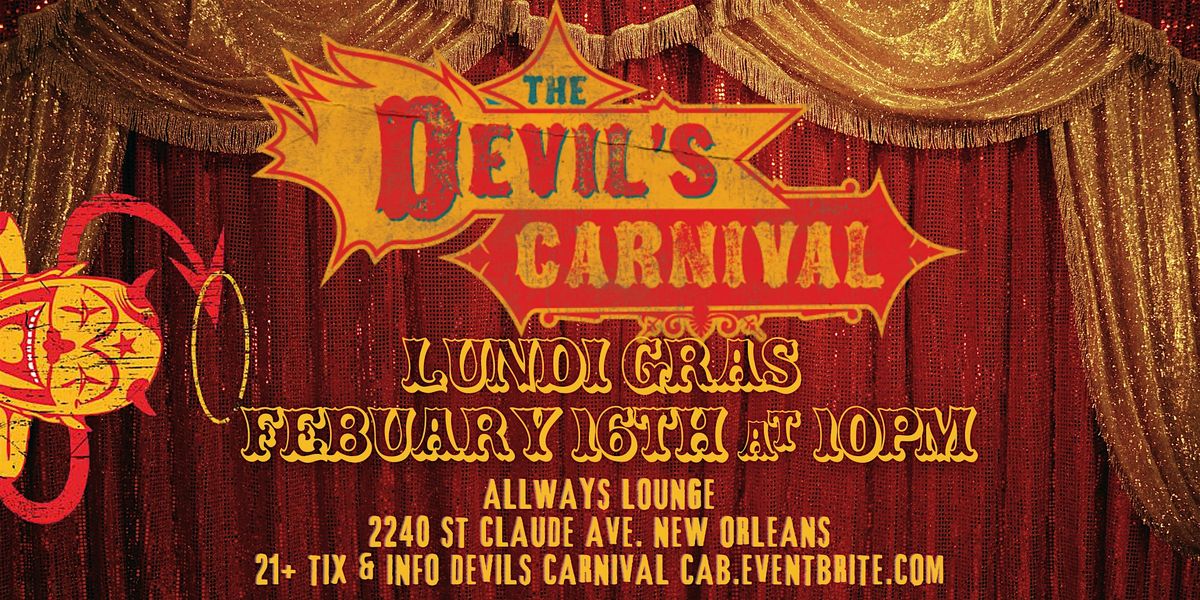 Based off the films "The Devil's Carnival" and "Alleluia! The Devil's Carnival" we are bringing a night of story telling along with circus, performances, drag, burlesque, sideshow, clownery..everything you could be looking for this Carnival season as we celebrate Lundi Gras into Fat Tuesday!