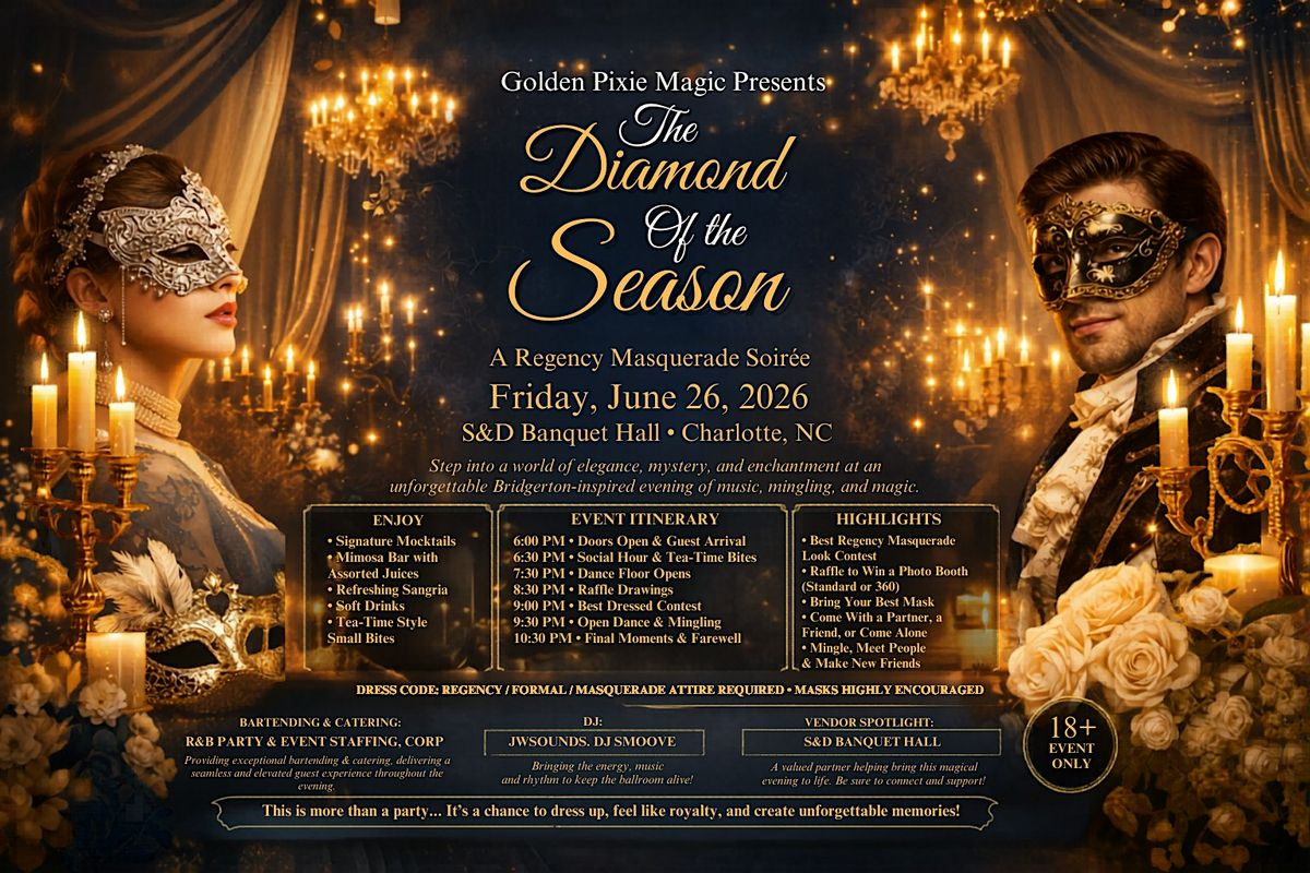 Step into a world of elegance, mystery, and enchantment at The Diamond of the Season—a Bridgerton-inspired masquerade experience designed for a night of music, mingling, and unforgettable memories.