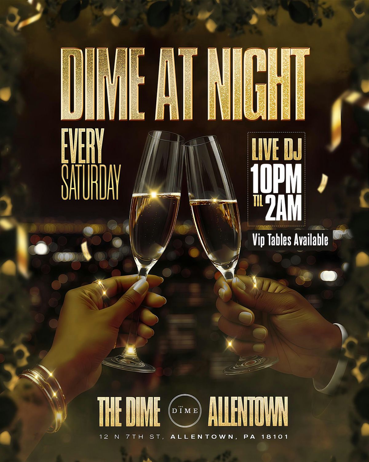 Join us for an unforgettable evening at The Dime at Night. This in-person event is all about good vibes, great company, and a night full of fun. Whether you're looking to unwind or dance the night away, we've got you covered. Don't miss out on the buzz and excitement—come see what everyone's talking about!