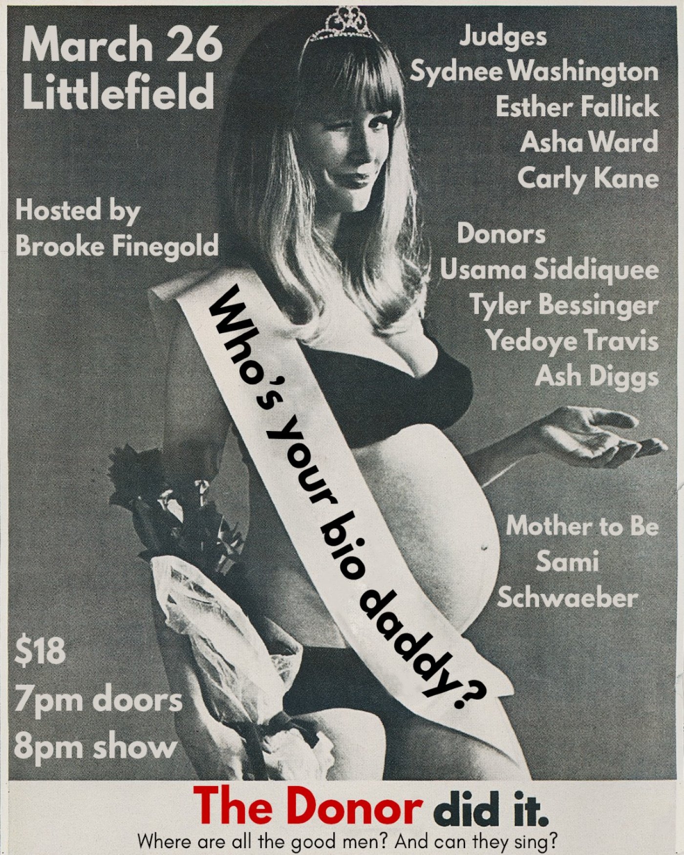 Four potential donors (who just so happen to be male comics) will be put to the test to determine WHO is mother-to-be, Sami Schwaeber’s perfect sperm donor. A panel of dykes will judge contestants based on their emotional intelligence, smarts, queer ally-ship, and most importantly: raw vocal talent. After all, who cares what he looks like… can he sing?! Some couples want their kids to be doctors, athletes, or rocket scientists, but Sami Schwaeber will stop at nothing to give birth to a STAR. Just because she’s not a gold star doesn’t mean her kid can’t be.