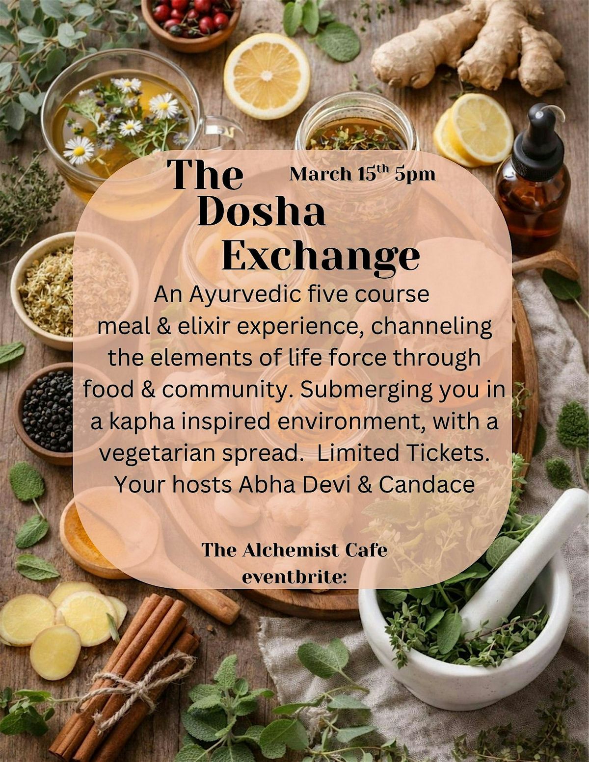 An Ayurvedic five course meal & elixir experience, channeling the elements of life force through food & community. Submerging you in a kapha inspired environment, with a vegetarian spread. We invite you to indulge in food that feeds your soul, paired with drinks that lift your spirit. This will be an enlightening dinner expierence as we guide you with intention and nutrition. Limited Tickets.